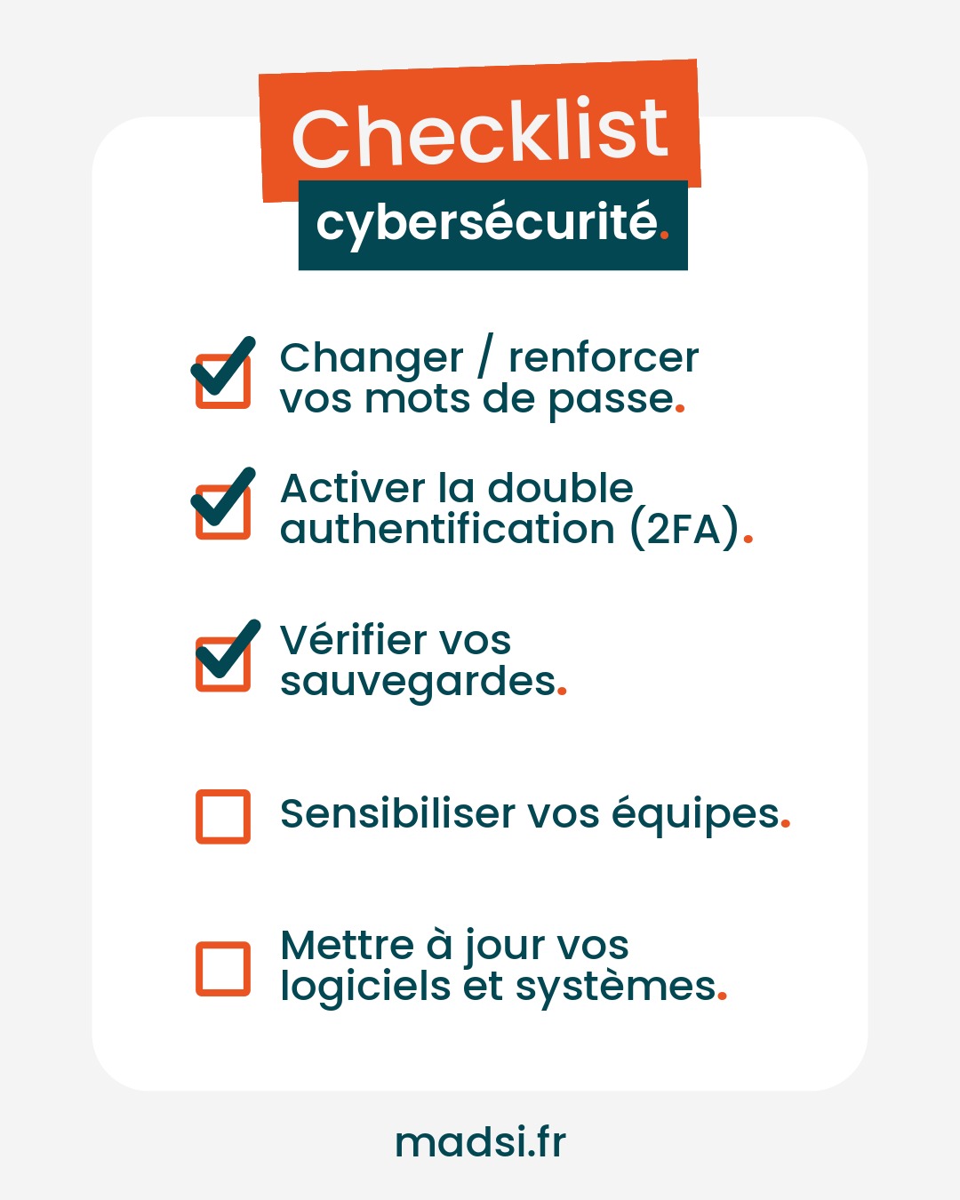 C’est le moment parfait pour remettre à plat vos bonnes pratiques numériques et repartir sur de bonnes bases. Nous vous avons concocté une checklist simple et concrète pour vous aider à sécuriser vos outils et protéger vos données.