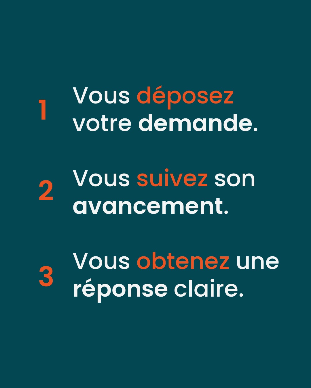 Vous déposez votre demande, vous suivez son avancement et surtout, vous obtenez une réponse claire.