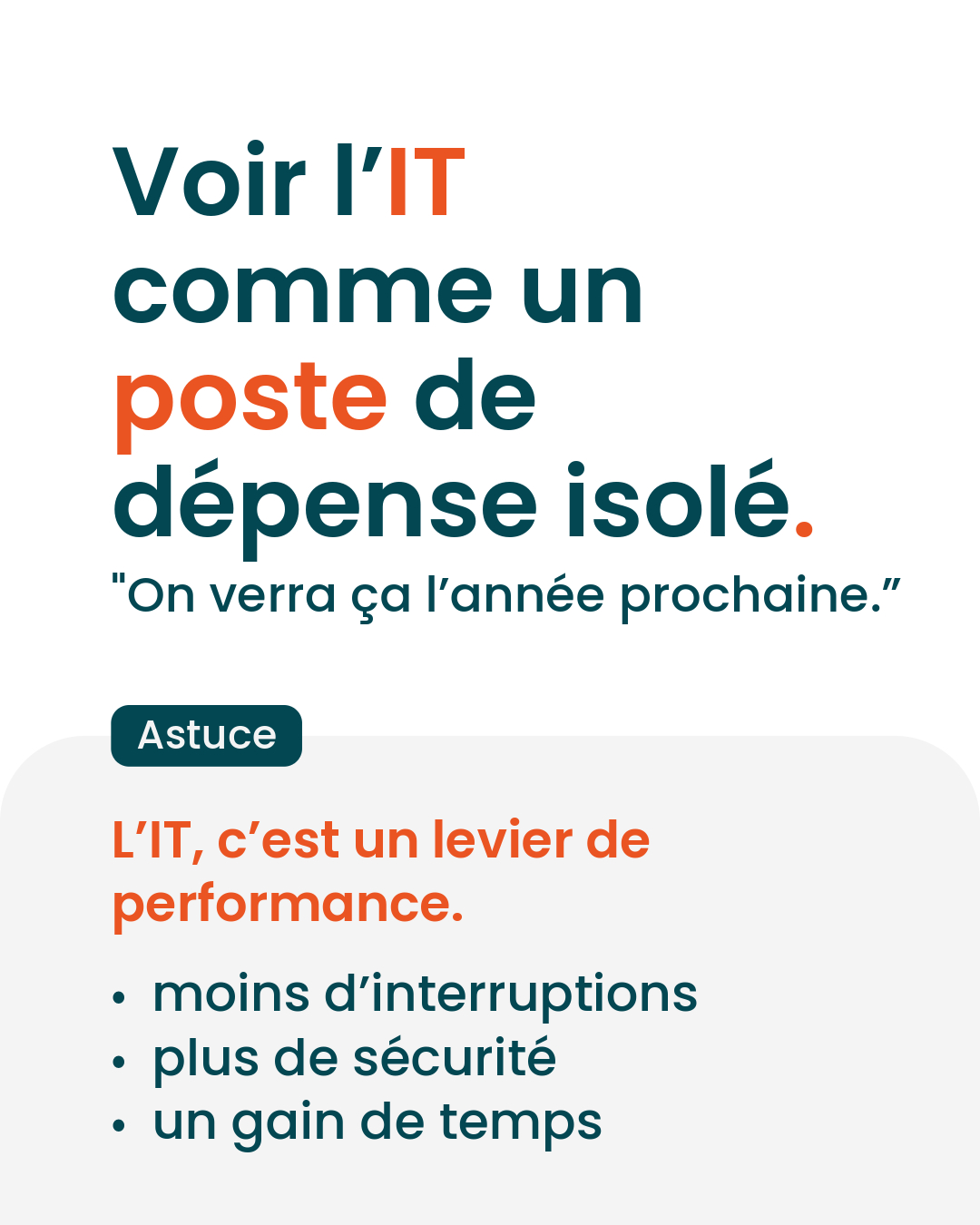 Le caractère innovant de notre service informatique tient à la rigueur de ses outils, à l'automatisation de nombreuses tâches et à la flexibilité de notre forfait mensuel qui évolue avec l'entreprise. La réactivité, l'agilité et la simplicité de nos solutions informatiques font notre différence.